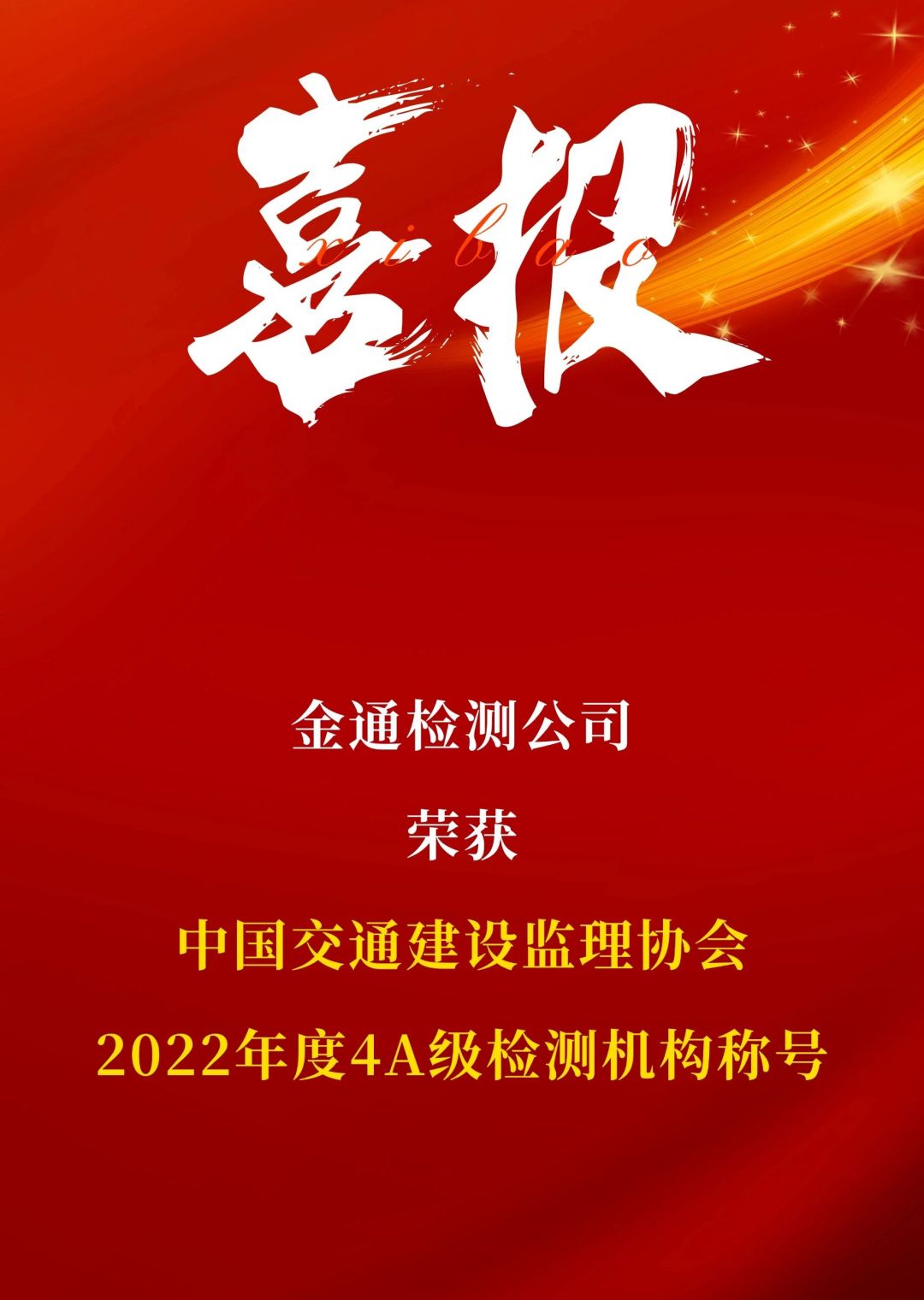 近日,在中国交通建设监理协会组织的2022年度交通建设质量检测机构评估等级中,金通检测公司被评为2022年度交通建设质量检测机构等级4A级,是川内仅有的两家4A级以上单位之一!