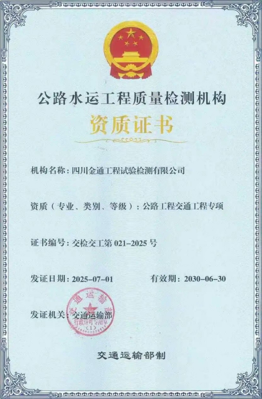 此次资质的获得,不仅是对金通检测公司管理水平和技术能力的权威认可,更为公司参与检测市场竞争、拓展业务范围提供了有力支撑。金通检测公司将以此为契机,持续提升检测服务,优化行业布局,为交通基础设施建设贡献更多精品工程。
