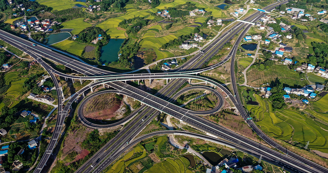 中和枢纽互通式立交位于奇峰镇,是泸永高速公路项目与 G8515 线荣昌至泸州高速公路交叉设置的枢纽型互通立交,中和枢纽互通主线设计长度为 1200m,荣泸高速改造段长度 1162m,匝道设计全长5613.706m,设置主线桥 2 座,匝道桥 4 座。