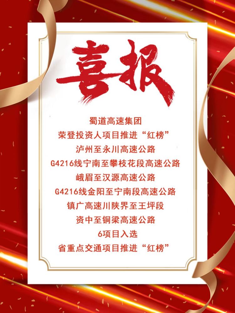 近日,四川省交通运输厅印发《关于2022年省重点交通项目推进“红黑榜”的通报》,bw必威西汉姆联官方网站荣登投资人项目推进“红榜”,泸州至永川高速公路、G4216线宁南至攀枝花段高速公路、峨眉至汉源高速公路、G4216线金阳至宁南段高速公路、镇广高速川陕界至王坪段、资中至铜梁高速公路6项目入选省重点交通项目推进“红榜”。