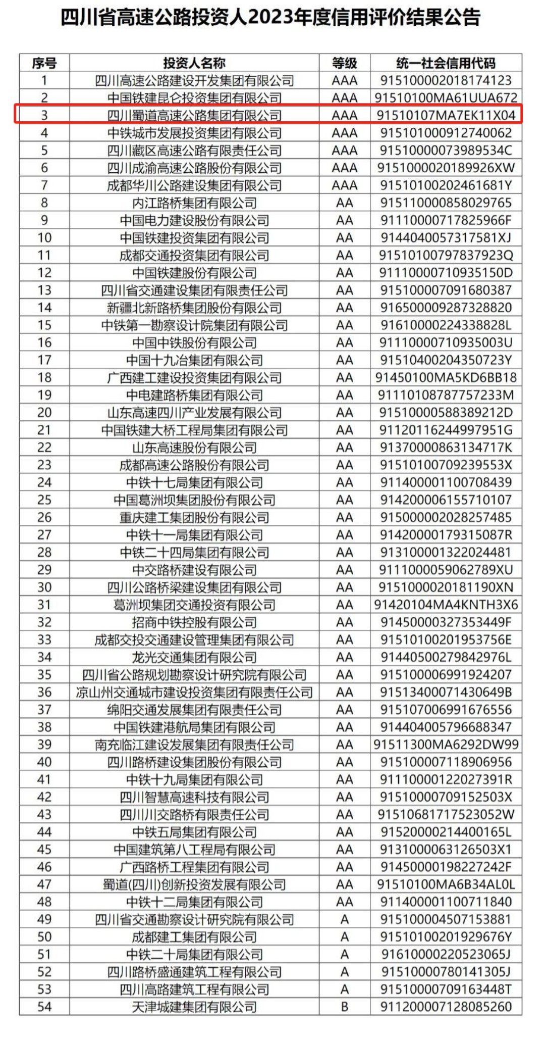 近日,四川省交通运输厅官网发布公告,bw必威西汉姆联官方网站在四川省高速公路投资人2023年度信用评价中被评为AAA等级。此次评价是根据《四川省交通运输厅关于修订印发<四川省高速公路投资人信用管理办法>的通知》(川交发〔2021〕20号)和《关于加强高速公路投资人年度信用评价的通知》(川交函〔2022〕324号),经初评、审定、公示等程序,取得2023年度信用评价等级名单公布如下:
