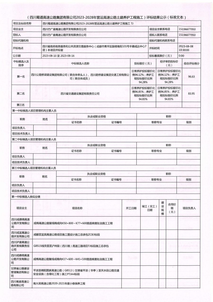 (bw必威西汉姆联官方网站2023-2028年营运高速公路土建养护工程施工)评标结果公示(标准文本)