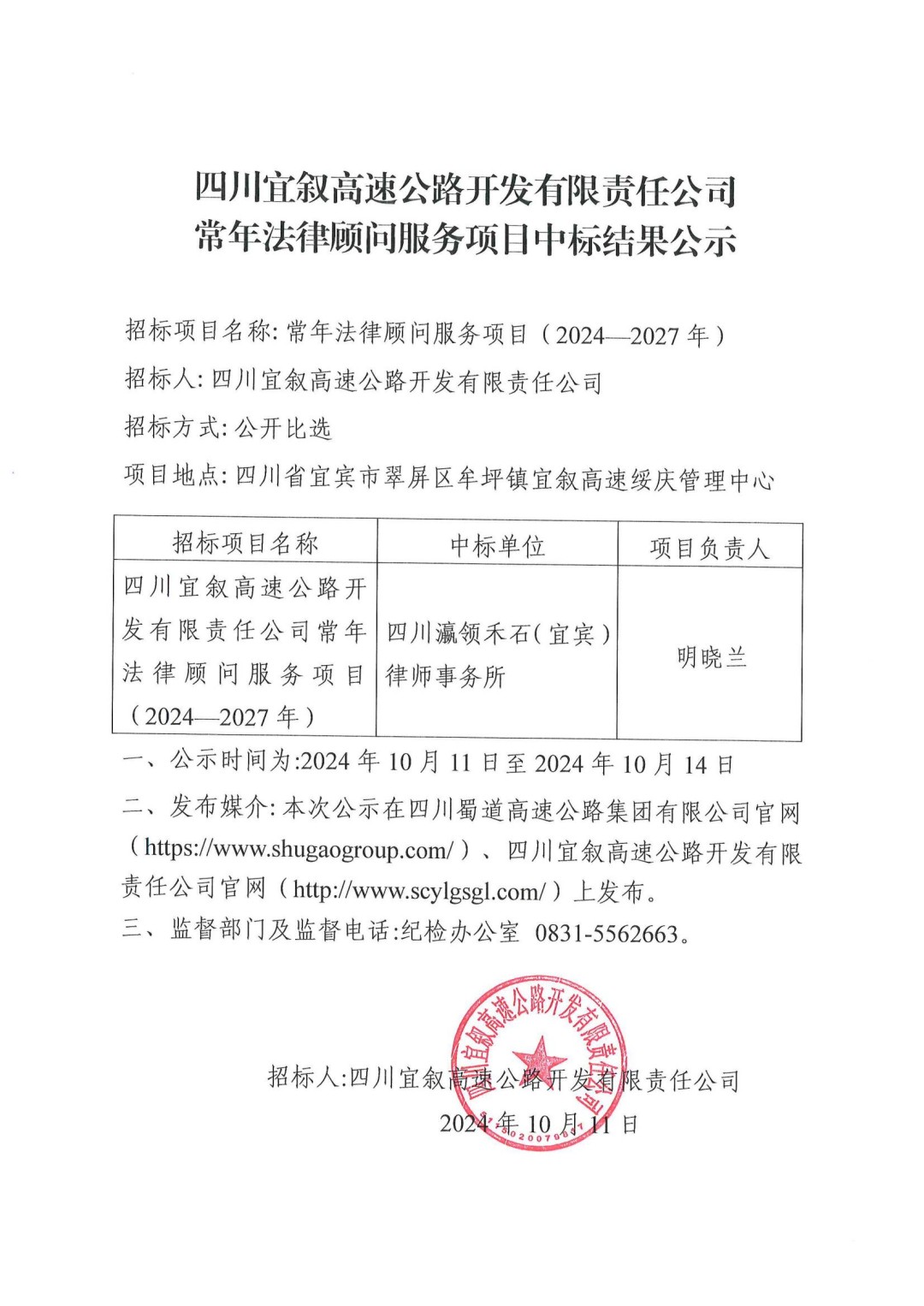 四川宜叙高速公路开发有限责任公司常年法律顾问服务项目中标结果公示