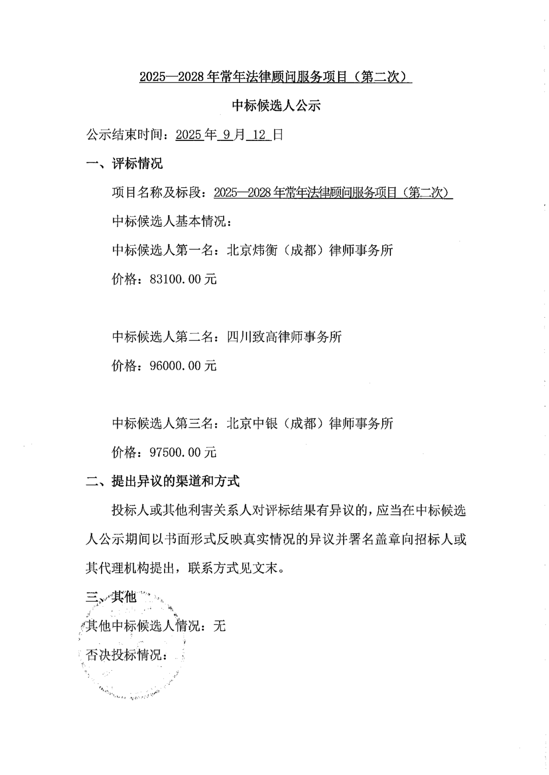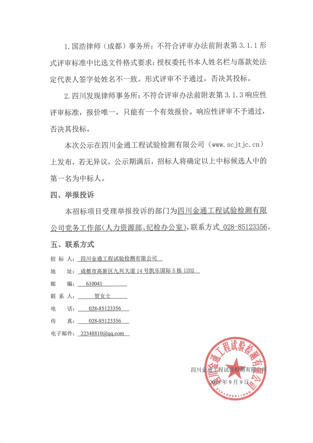四川金通工程试验检测有限公司2025-2028年常年法律顾问服务项目(第二次)中标候选人公示