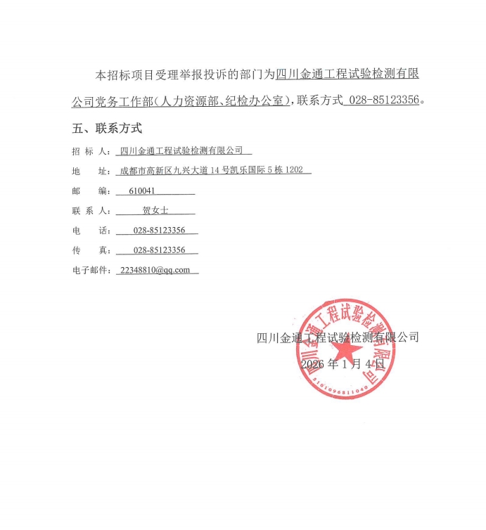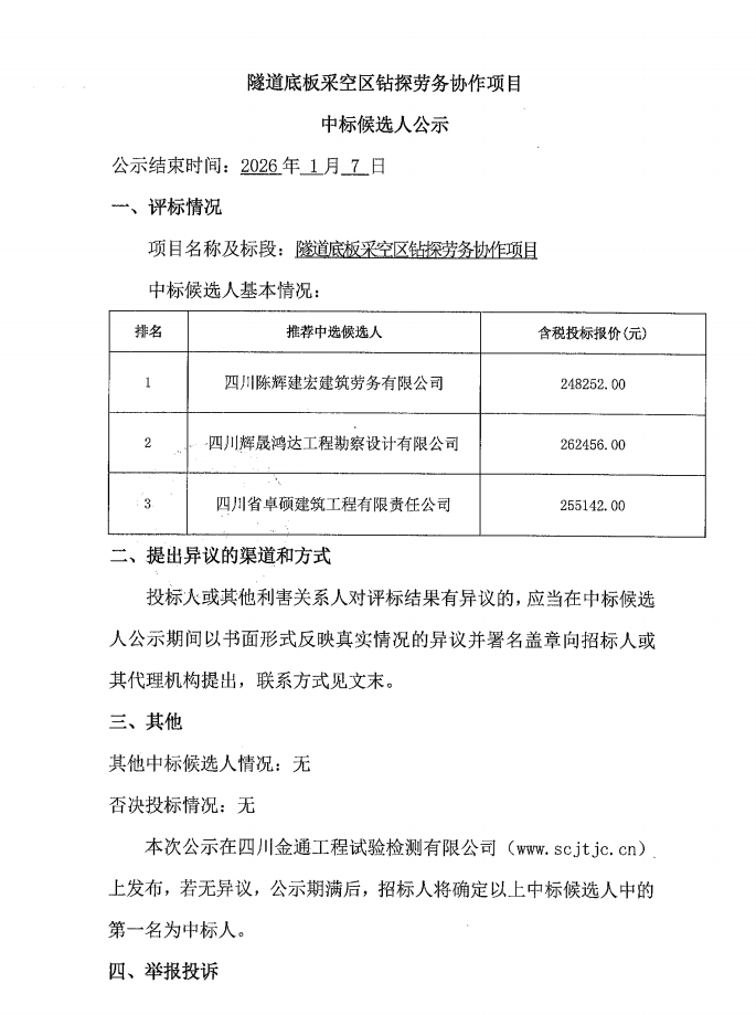 隧道底板采空区钻探劳务协作项目中标候选人公示