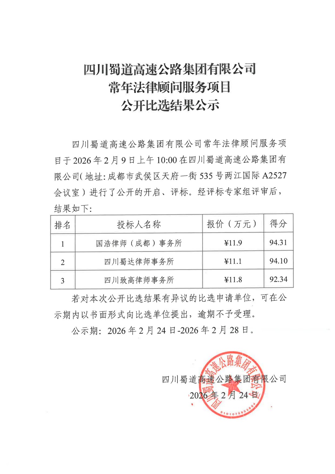隧道底板采空区钻探劳务协作项目中标候选人公示