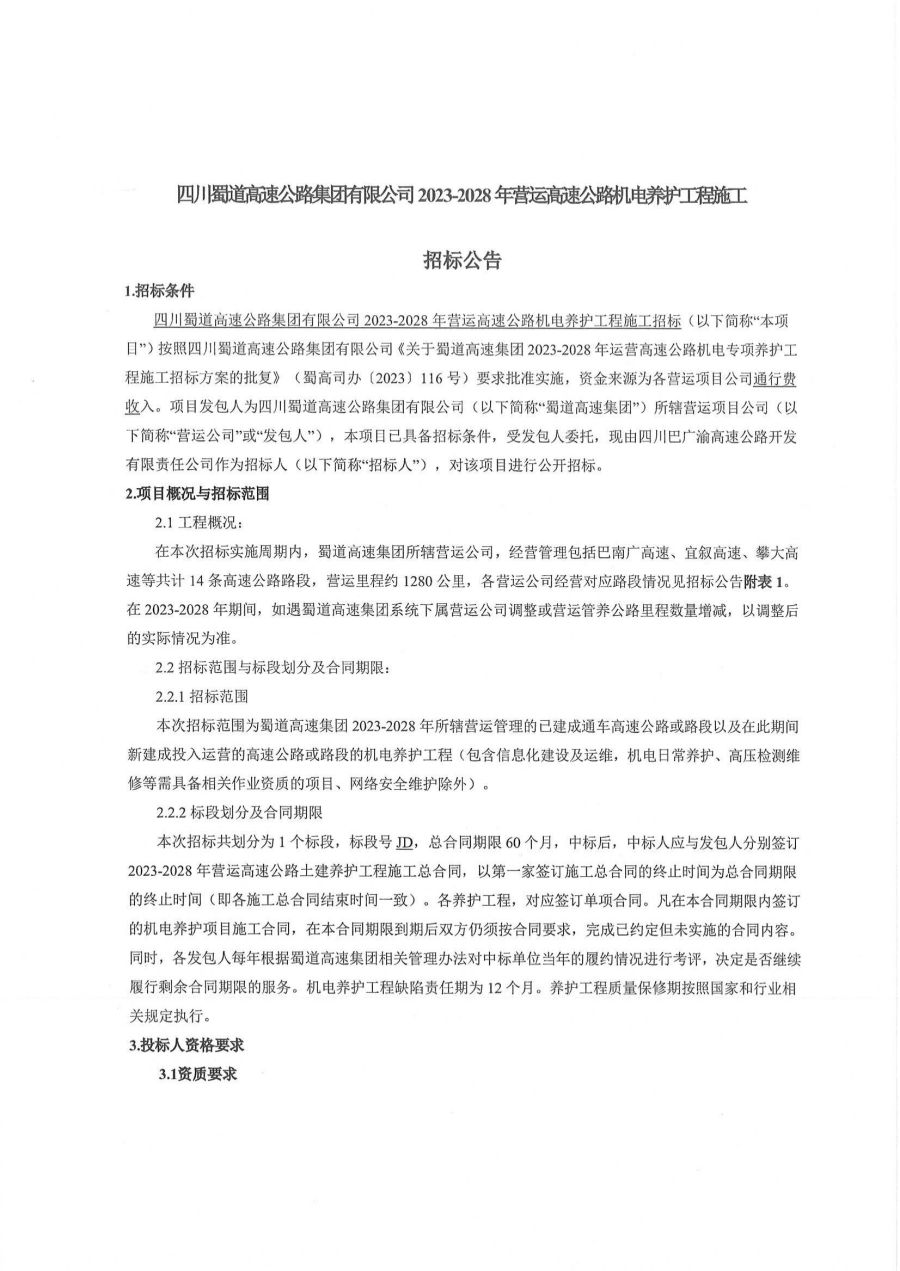 bw必威西汉姆联官方网站2023-2028年营运高速公路机电养护工程施工招标公告