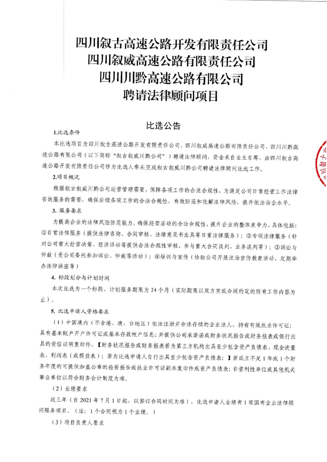 叙古叙威川黔公司聘请法律顾问项目比选公告