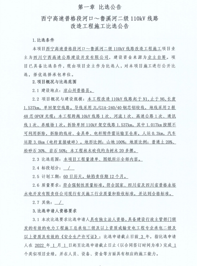 西宁高速普格段河口~鲁溪河二级110kV线路改造工程施工比选公告.pdf